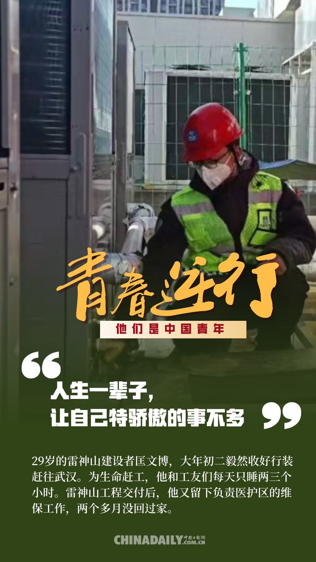 百年前,中國(guó)青年用春春和熱血,為祖國(guó)的前途命運(yùn)而抗?fàn)?;百年后,中?guó)青年秉承先輩精神,沖鋒在保衛(wèi)人民健康安全的戰(zhàn)疫前線。危機(jī)之時(shí),他們總是挺身而出,主動(dòng)申請(qǐng)到國(guó)家和人民最需要的地方去。在這場(chǎng)疫情防控阻擊戰(zhàn)中,4.2萬(wàn)多名援鄂醫(yī)護(hù)人員里有1.2萬(wàn)多名“90后”,還有一部分是“95后”“00后”,此外,在基建工人、公安干警、志愿者、網(wǎng)格員等抗“疫”隊(duì)伍里也有許多年輕的面孔,他們?cè)谝咔榉揽刂猩嵘?、迎難而上,為我們筑起了一道道鋼鐵長(zhǎng)城。這些人是當(dāng)代中國(guó)青年的縮影,他們用行動(dòng)證明,中國(guó)青年是堪當(dāng)大任的!