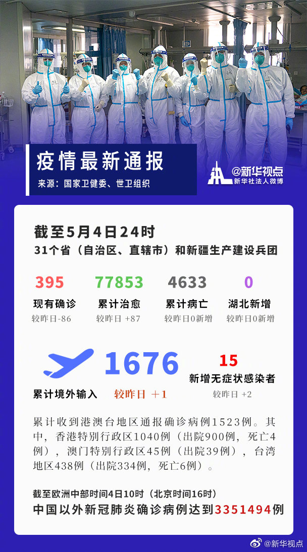 截至5月4日24時,據(jù)31個?。ㄗ灾螀^(qū)、直轄市)和新疆生產(chǎn)建設(shè)兵團(tuán)報告,現(xiàn)有確診病例395例(其中重癥病例29例),累計治愈出院病例77853例,累計死亡病例4633例,累計報告確診病例82881例,現(xiàn)有疑似病例2例。累計追蹤到密切接觸者735240人,尚在醫(yī)學(xué)觀察的密切接觸者7152人。