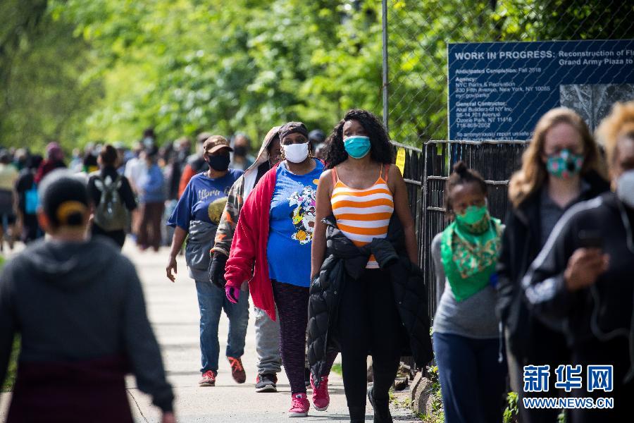 5月3日,在美國紐約,人們在一個發(fā)放點排隊領(lǐng)取口罩。 新華社發(fā)(郭克攝)