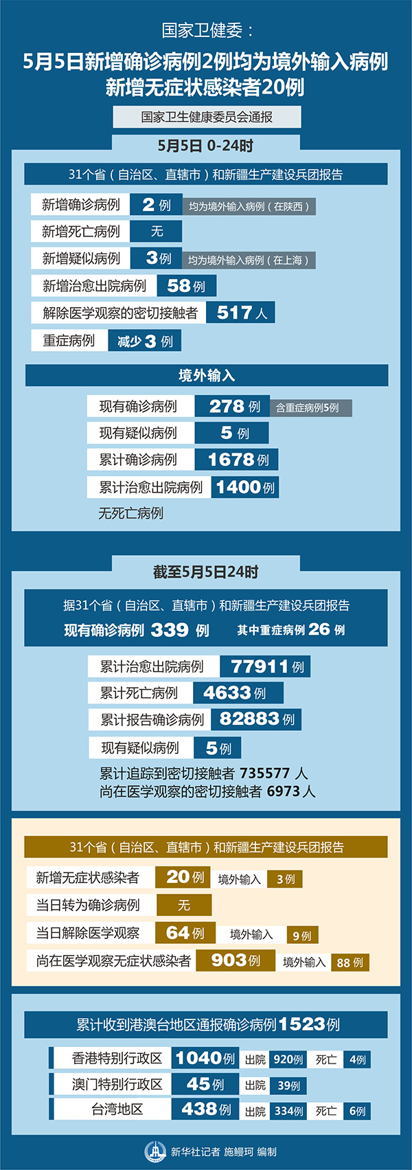 截至5月5日24時,據(jù)31個?。ㄗ灾螀^(qū)、直轄市)和新疆生產(chǎn)建設兵團報告,現(xiàn)有確診病例339例(其中重癥病例26例),累計治愈出院病例77911例,累計死亡病例4633例,累計報告確診病例82883例,現(xiàn)有疑似病例5例。累計追蹤到密切接觸者735577人,尚在醫(yī)學觀察的密切接觸者6973人。