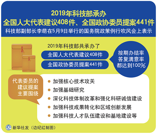 新華社北京5月9日電(記者張泉、董瑞豐)科技部副部長李萌在9日舉行的國務(wù)院政策例行吹風(fēng)會(huì)上表示,去年科技部共承辦了全國人大代表建議408件、全國政協(xié)委員提案441件,按期辦結(jié)率和答復(fù)滿意率都達(dá)到100%。