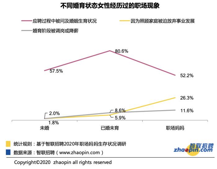 不同婚育狀態(tài)女性經(jīng)歷過的職場現(xiàn)象。圖片來源:《2020年職場媽媽生存狀況調(diào)查報告》
