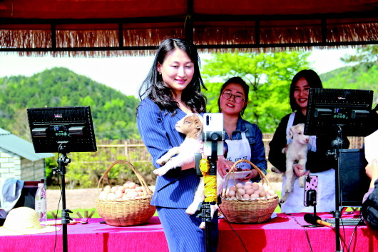 4月7日,在安徽香茗山的喜樂(lè)田園農(nóng)場(chǎng),太湖縣副縣長(zhǎng)唐翔與網(wǎng)友互動(dòng)。 受訪者供圖