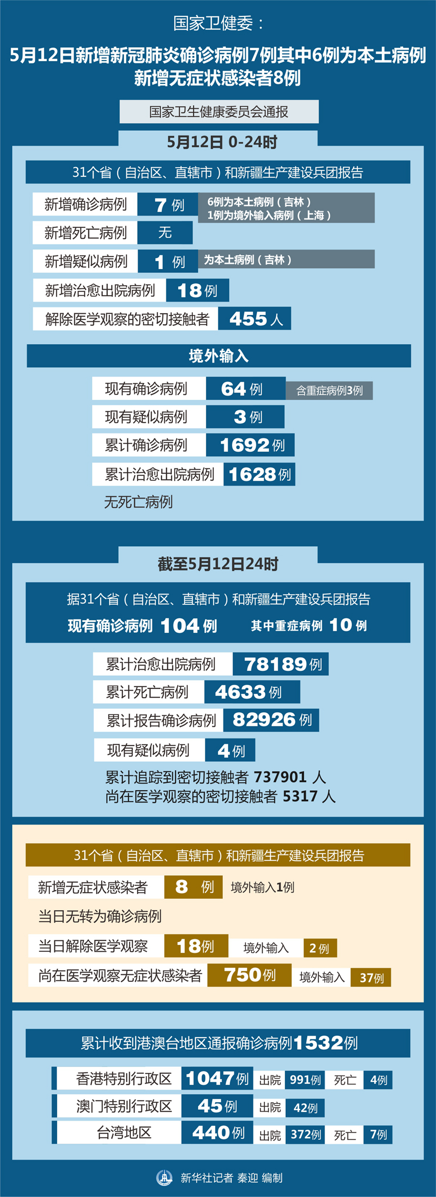 截至5月12日24時,據(jù)31個?。ㄗ灾螀^(qū)、直轄市)和新疆生產(chǎn)建設(shè)兵團報告,現(xiàn)有確診病例104例(其中重癥病例10例),累計治愈出院病例78189例,累計死亡病例4633例,累計報告確診病例82926例,現(xiàn)有疑似病例4例。累計追蹤到密切接觸者737901人,尚在醫(yī)學(xué)觀察的密切接觸者5317人。