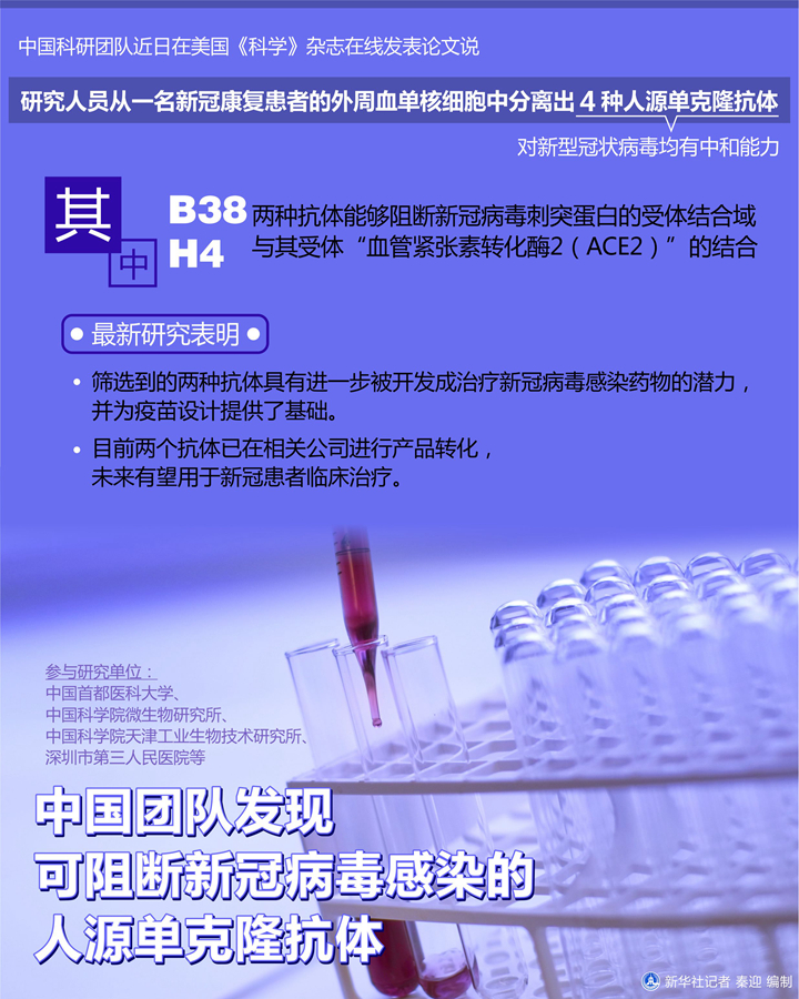 圖表:中國團隊發(fā)現(xiàn)可阻斷新冠病毒感染的人源單克隆抗體 新華社記者 秦迎 編制