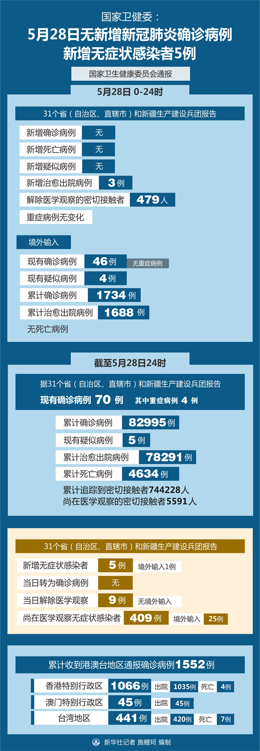 截至5月28日24時,據(jù)31個省(自治區(qū)、直轄市)和新疆生產(chǎn)建設(shè)兵團報告,現(xiàn)有確診病例70例(其中重癥病例4例),累計治愈出院病例78291例,累計死亡病例4634例,累計報告確診病例82995例,現(xiàn)有疑似病例5例。累計追蹤到密切接觸者744228人,尚在醫(yī)學(xué)觀察的密切接觸者5591人。
