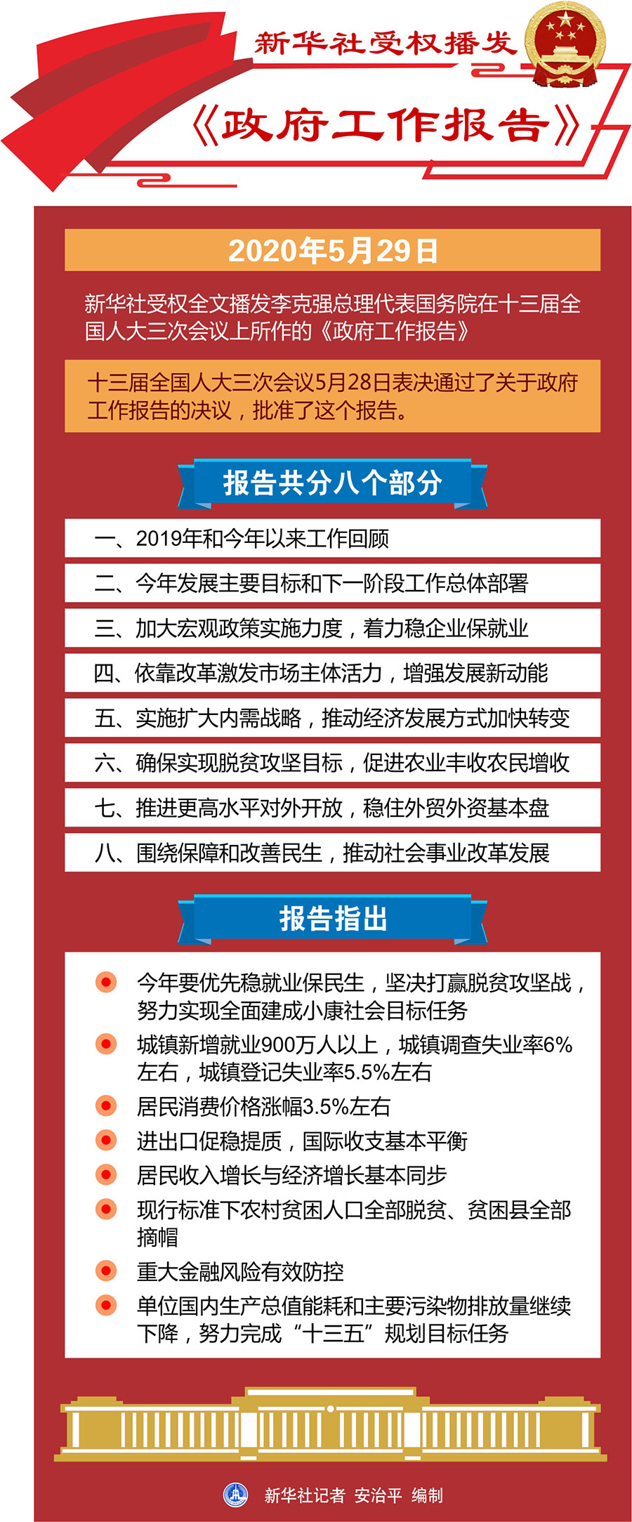 新華社北京5月29日電 新華社受權(quán)于29日全文播發(fā)李克強(qiáng)總理代表國(guó)務(wù)院在十三屆全國(guó)人大三次會(huì)議上所作的《政府工作報(bào)告》。十三屆全國(guó)人大三次會(huì)議5月28日表決通過了關(guān)于政府工作報(bào)告的決議,批準(zhǔn)了這個(gè)報(bào)告。