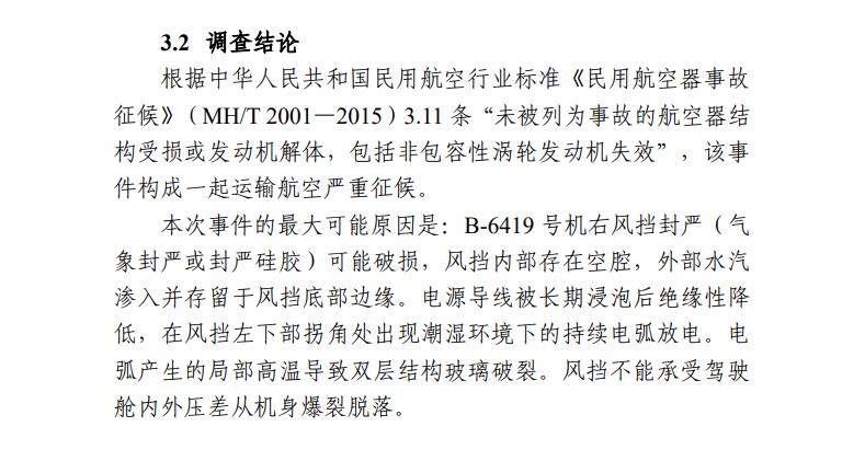 調(diào)查報告顯示,本次事件的最大可能原因是:B-6419號機(jī)右風(fēng)擋封嚴(yán)(氣象封嚴(yán)或封嚴(yán)硅膠)可能破損,風(fēng)擋內(nèi)部存在空腔,外部水汽滲入并存留于風(fēng)擋底部邊緣。電源導(dǎo)線被長期浸泡后絕緣性降低,在風(fēng)擋左下部拐角處出現(xiàn)潮濕環(huán)境下的持續(xù)電弧放電。電弧產(chǎn)生的局部高溫導(dǎo)致雙層結(jié)構(gòu)玻璃破裂。風(fēng)擋不能承受駕駛艙內(nèi)外壓差從機(jī)身爆裂脫落。