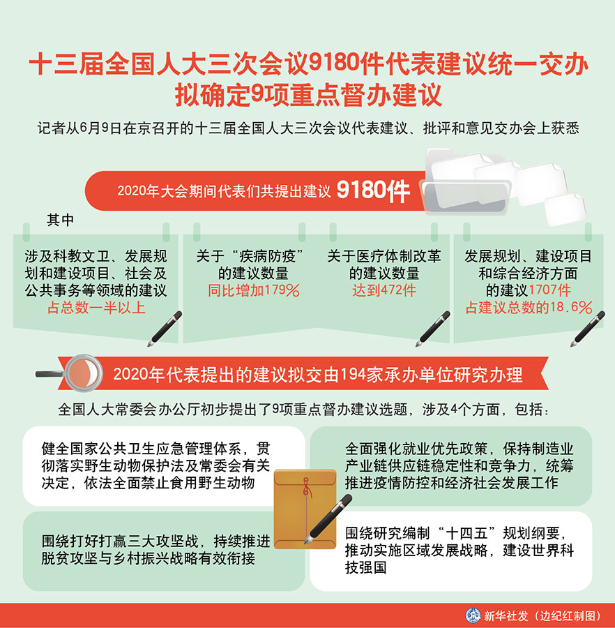 按照代表法有關(guān)規(guī)定,今年代表提出的建議擬交由194家承辦單位研究辦理。全國(guó)人大常委會(huì)辦公廳初步提出了9項(xiàng)重點(diǎn)督辦建議選題,涉及4個(gè)方面,包括:健全國(guó)家公共衛(wèi)生應(yīng)急管理體系,貫徹落實(shí)野生動(dòng)物保護(hù)法及常委會(huì)有關(guān)決定,依法全面禁止食用野生動(dòng)物;全面強(qiáng)化就業(yè)優(yōu)先政策,保持制造業(yè)產(chǎn)業(yè)鏈供應(yīng)鏈穩(wěn)定性和競(jìng)爭(zhēng)力,統(tǒng)籌推進(jìn)疫情防控和經(jīng)濟(jì)社會(huì)發(fā)展工作;圍繞打好打贏三大攻堅(jiān)戰(zhàn),持續(xù)推進(jìn)脫貧攻堅(jiān)與鄉(xiāng)村振興戰(zhàn)略有效銜接;圍繞研究編制“十四五”規(guī)劃綱要,推動(dòng)實(shí)施區(qū)域發(fā)展戰(zhàn)略,建設(shè)世界科技強(qiáng)國(guó)。