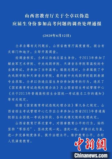 經(jīng)調查核實,仝卓以偽造應屆生身份,于2013年參加解放軍藝術學院、中央戲劇學院、天津音樂學院等高校的專業(yè)課考試,并參加當年高考,被中央戲劇學院歌劇表演專業(yè)錄取。依據(jù)《國家教育考試違規(guī)處理辦法》第九條之規(guī)定,山西省招生考試管理中心作出仝卓參加山西省2013年普通高校招生全國統(tǒng)一考試各階段、各科成績無效的處理決定。