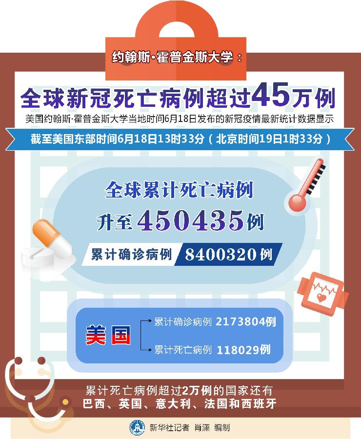 新華社紐約6月18日電 美國(guó)約翰斯·霍普金斯大學(xué)18日發(fā)布的新冠疫情最新統(tǒng)計(jì)數(shù)據(jù)顯示,全球累計(jì)死亡病例超過(guò)45萬(wàn)例。