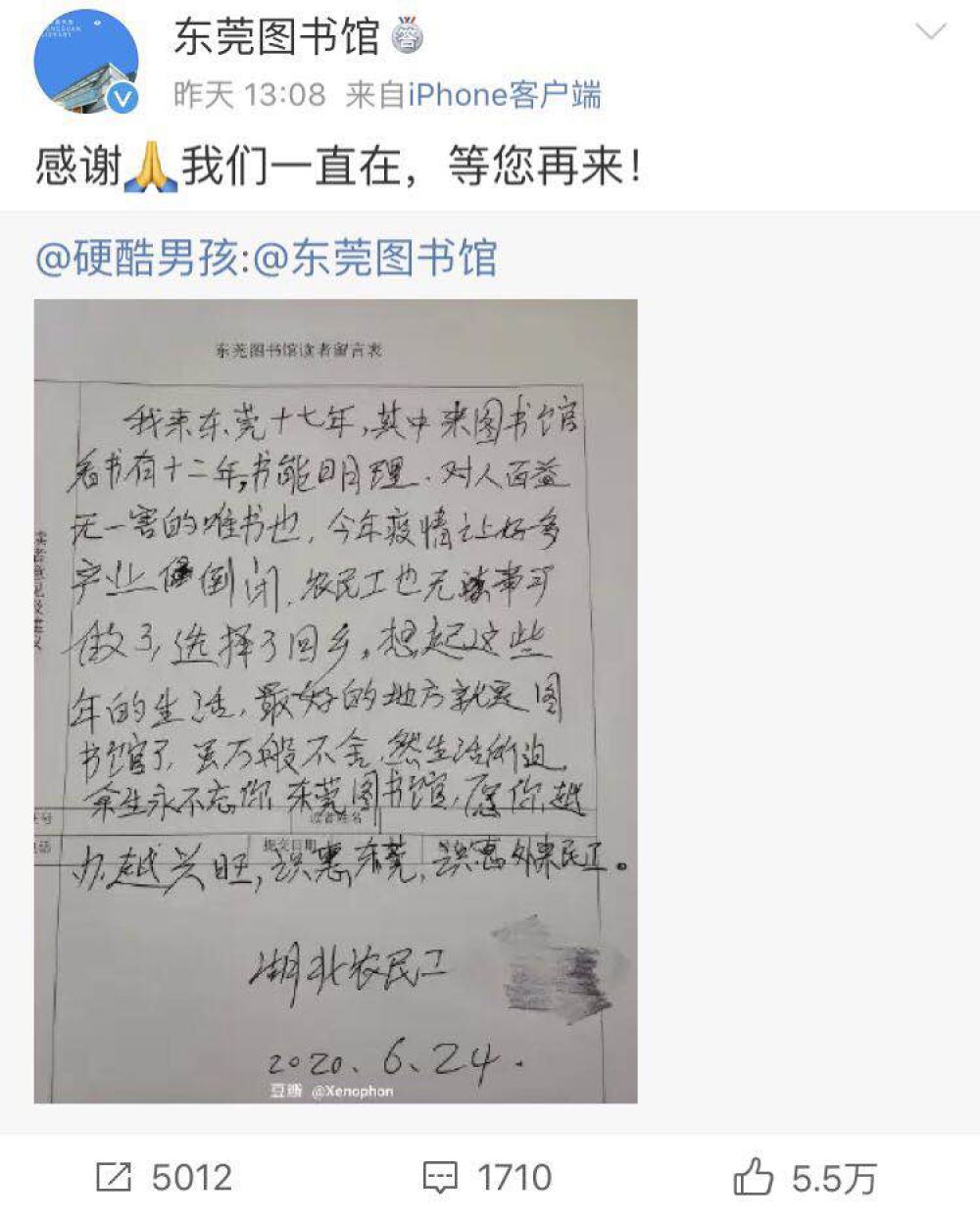 “我來東莞十七年,其中來圖書館看書有十二年。書能明理,對人百益無一害的唯書也。今年疫情讓好多產業(yè)(企業(yè))倒閉,農民工也無事可做了,選擇了回鄉(xiāng)。想起這些年的生活,最好的地方就是圖書館了。雖萬般不舍,然生活所迫,余生永不忘你,東莞圖書館,愿你越辦越興旺。識惠東莞,識惠外來農民工?!?/span>
