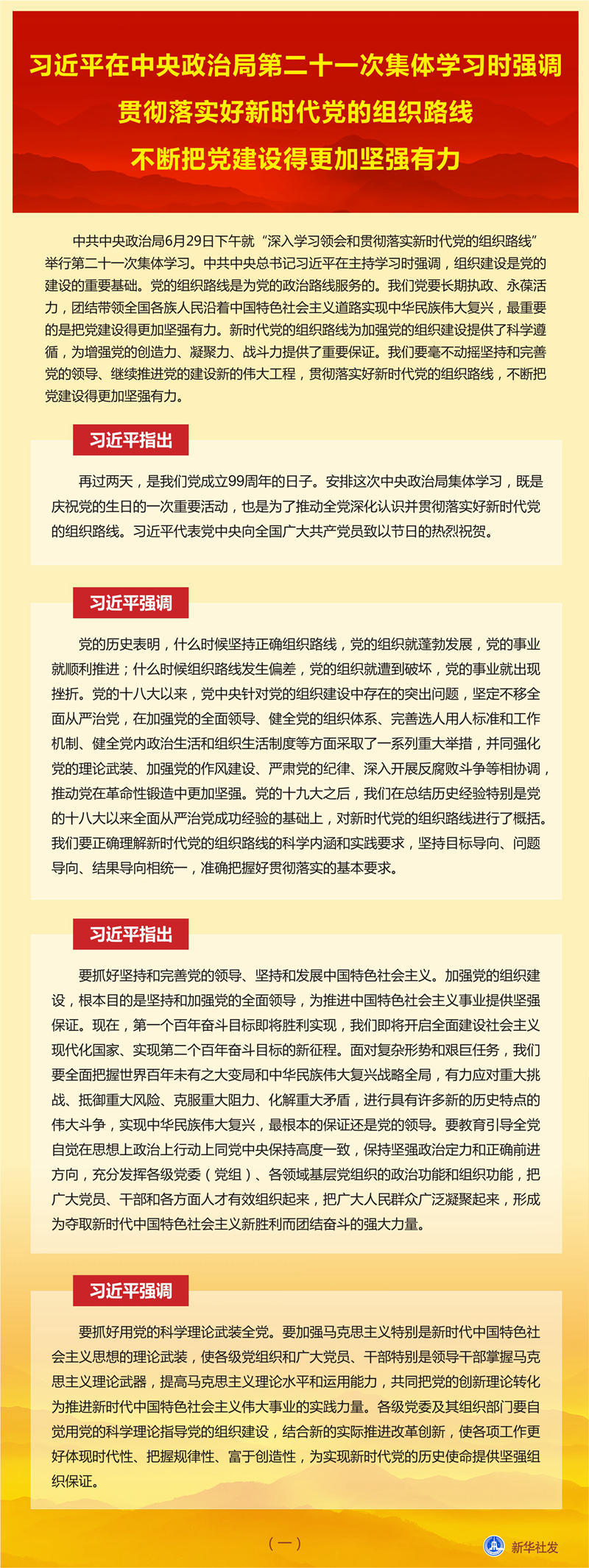 新華社北京6月30日電 中共中央政治局6月29日下午就“深入學(xué)習(xí)領(lǐng)會(huì)和貫徹落實(shí)新時(shí)代黨的組織路線”舉行第二十一次集體學(xué)習(xí)。中共中央總書記習(xí)近平在主持學(xué)習(xí)時(shí)強(qiáng)調(diào),組織建設(shè)是黨的建設(shè)的重要基礎(chǔ)。黨的組織路線是為黨的政治路線服務(wù)的。我們黨要長期執(zhí)政、永葆活力,團(tuán)結(jié)帶領(lǐng)全國各族人民沿著中國特色社會(huì)主義道路實(shí)現(xiàn)中華民族偉大復(fù)興,最重要的是把黨建設(shè)得更加堅(jiān)強(qiáng)有力。新時(shí)代黨的組織路線為加強(qiáng)黨的組織建設(shè)提供了科學(xué)遵循,為增強(qiáng)黨的創(chuàng)造力、凝聚力、戰(zhàn)斗力提供了重要保證。我們要毫不動(dòng)搖堅(jiān)持和完善黨的領(lǐng)導(dǎo)、繼續(xù)推進(jìn)黨的建設(shè)新的偉大工程,貫徹落實(shí)好新時(shí)代黨的組織路線,不斷把黨建設(shè)得更加堅(jiān)強(qiáng)有力。