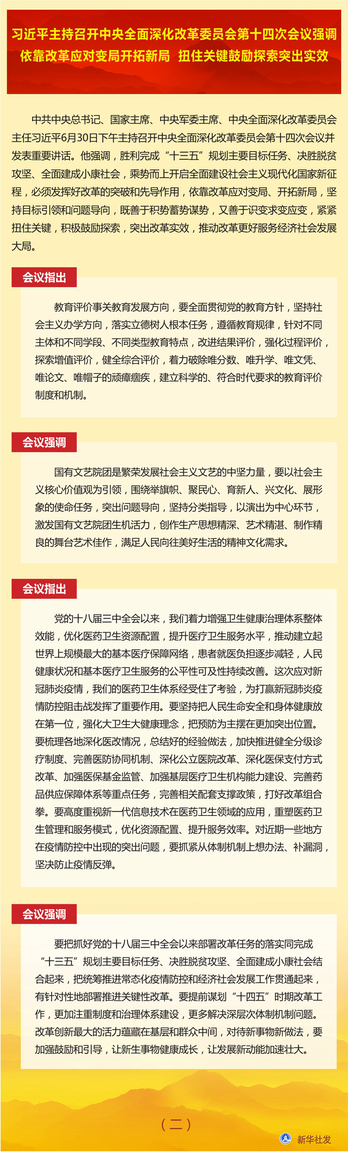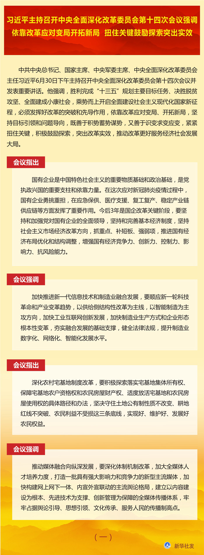 新華社北京6月30日電? 中共中央總書記、國家主席、中央軍委主席、中央全面深化改革委員會主任習(xí)近平6月30日下午主持召開中央全面深化改革委員會第十四次會議并發(fā)表重要講話。他強(qiáng)調(diào),勝利完成“十三五”規(guī)劃主要目標(biāo)任務(wù)、決勝脫貧攻堅(jiān)、全面建成小康社會,乘勢而上開啟全面建設(shè)社會主義現(xiàn)代化國家新征程,必須發(fā)揮好改革的突破和先導(dǎo)作用,依靠改革應(yīng)對變局、開拓新局,堅(jiān)持目標(biāo)引領(lǐng)和問題導(dǎo)向,既善于積勢蓄勢謀勢,又善于識變求變應(yīng)變,緊緊扭住關(guān)鍵,積極鼓勵(lì)探索,突出改革實(shí)效,推動改革更好服務(wù)經(jīng)濟(jì)社會發(fā)展大局。