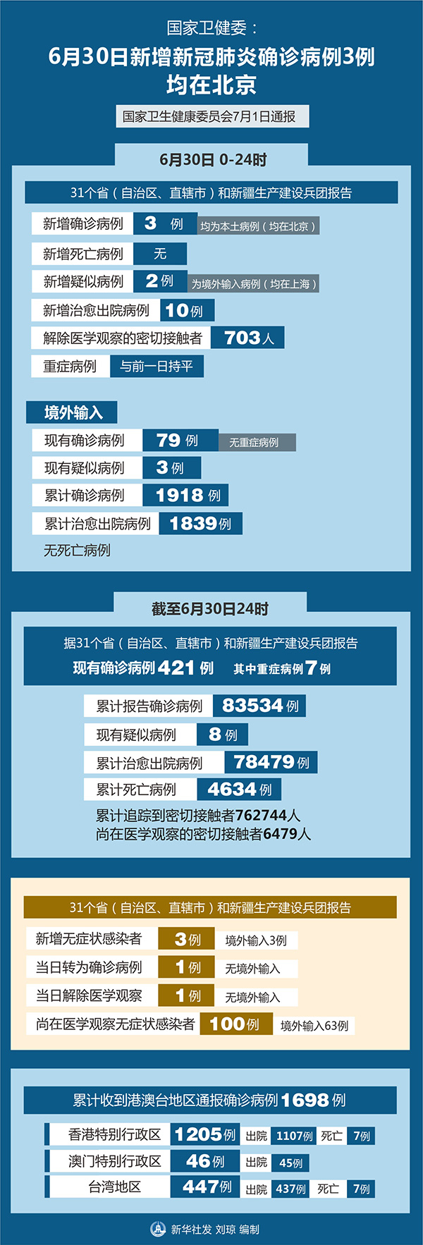 新華社北京7月1日電(記者胡喆)國家衛(wèi)生健康委員會7月1日通報,6月30日0-24時,31個?。ㄗ灾螀^(qū)、直轄市)和新疆生產(chǎn)建設(shè)兵團(tuán)報告新增確診病例3例,均為本土病例(均在北京);無新增死亡病例;新增疑似病例2例,為境外輸入病例(均在上海)。