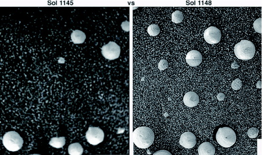 在巖層頂部的這些“生命”是集體定向的,帽子和莖向上傾斜,像沖著某個(gè)光源進(jìn)行光合作用。此外,“機(jī)遇號(hào)”還拍到了在無風(fēng)情況下,12個(gè)球形“生命”冒出土壤,另外11個(gè)“生命”在三天內(nèi)明顯長大的照片。