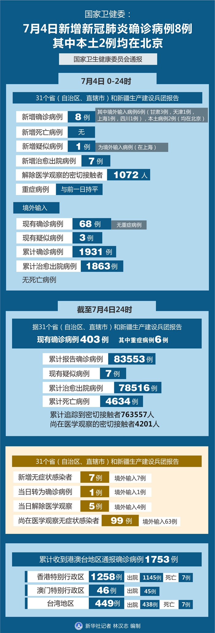 截至7月4日24時(shí),據(jù)31個(gè)省(自治區(qū)、直轄市)和新疆生產(chǎn)建設(shè)兵團(tuán)報(bào)告,現(xiàn)有確診病例403例(其中重癥病例6例),累計(jì)治愈出院病例78516例,累計(jì)死亡病例4634例,累計(jì)報(bào)告確診病例83553例,現(xiàn)有疑似病例7例。累計(jì)追蹤到密切接觸者763557人,尚在醫(yī)學(xué)觀察的密切接觸者4201人。