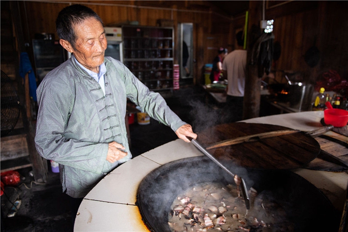 在湘西十八洞村,82歲的施成富在自家的農(nóng)家樂里炒臘肉(6月29日攝)。新華社記者 陳思汗 攝
