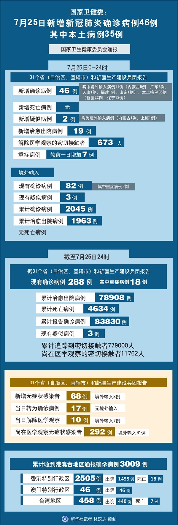 截至7月25日24時,據(jù)31個?。ㄗ灾螀^(qū)、直轄市)和新疆生產(chǎn)建設兵團報告,現(xiàn)有確診病例288例(其中重癥病例18例),累計治愈出院病例78908例,累計死亡病例4634例,累計報告確診病例83830例,現(xiàn)有疑似病例3例。累計追蹤到密切接觸者779000人,尚在醫(yī)學觀察的密切接觸者11762人。