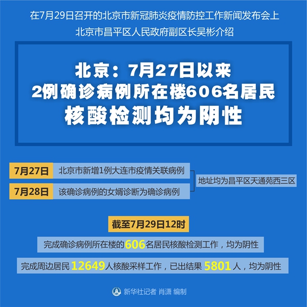 新華社北京7月29日電(記者陳旭)在29日召開的北京市新冠肺炎疫情防控工作新聞發(fā)布會(huì)上,北京市昌平區(qū)人民政府副區(qū)長吳彬介紹,27日以來2例大連市疫情關(guān)聯(lián)確診病例所在樓606名居民核酸檢測(cè)工作已完成,均為陰性。周邊居民12649人核酸采樣工作已出結(jié)果5801人,均為陰性。