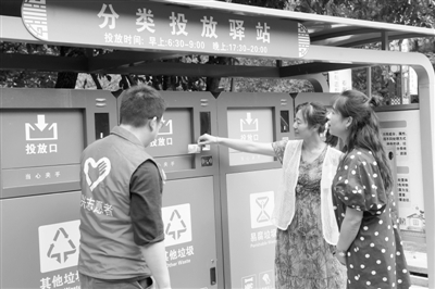 在金華市金東區(qū)的每個(gè)垃圾投放點(diǎn)附近,都有一名垃圾巡檢員會(huì)協(xié)助居民做好分類,定時(shí)、定點(diǎn)投放垃圾。