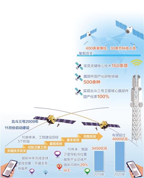 “北斗三號2009年11月份啟動建設。10余年來,工程建設歷經關鍵技術攻關、試驗衛(wèi)星工程、最簡系統(tǒng)、基本系統(tǒng)、完整系統(tǒng)5個階段,提前半年完成全球星座部署,開通全系統(tǒng)服務。建成即開通、開通即服務,工程建設取得了巨大成就。”冉承其說。