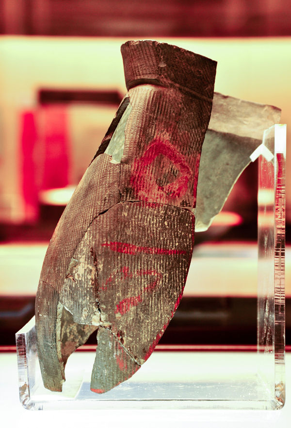 陶寺遺址出土的朱書(shū)扁壺,其上為朱砂書(shū)寫(xiě)的“堯”字