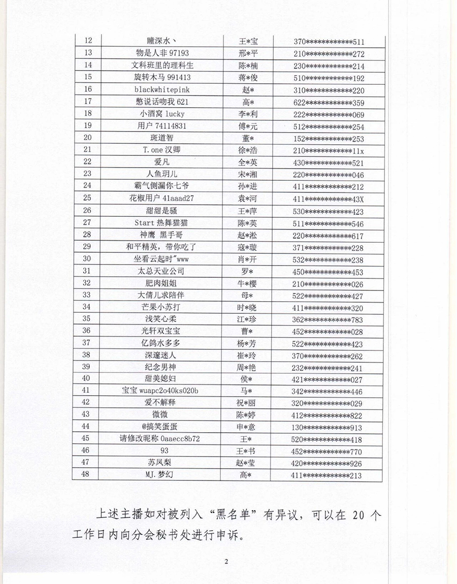 根據(jù)《互聯(lián)網(wǎng)文化管理暫行規(guī)定》《網(wǎng)絡(luò)表演經(jīng)營活動管理辦法》《互聯(lián)網(wǎng)直播服務(wù)管理規(guī)定》等相關(guān)法律法規(guī),按照《網(wǎng)絡(luò)表演(直播)行業(yè)主播“黑名單”管理制度》《黑名單認定工作流程》規(guī)定,中國演出行業(yè)協(xié)會網(wǎng)絡(luò)表演(直播)分會現(xiàn)向社會公布第六批主播黑名單,被列入黑名單的主播將在行業(yè)內(nèi)禁止注冊和直播,封禁期限5年。(總臺央視記者 曹巖)
