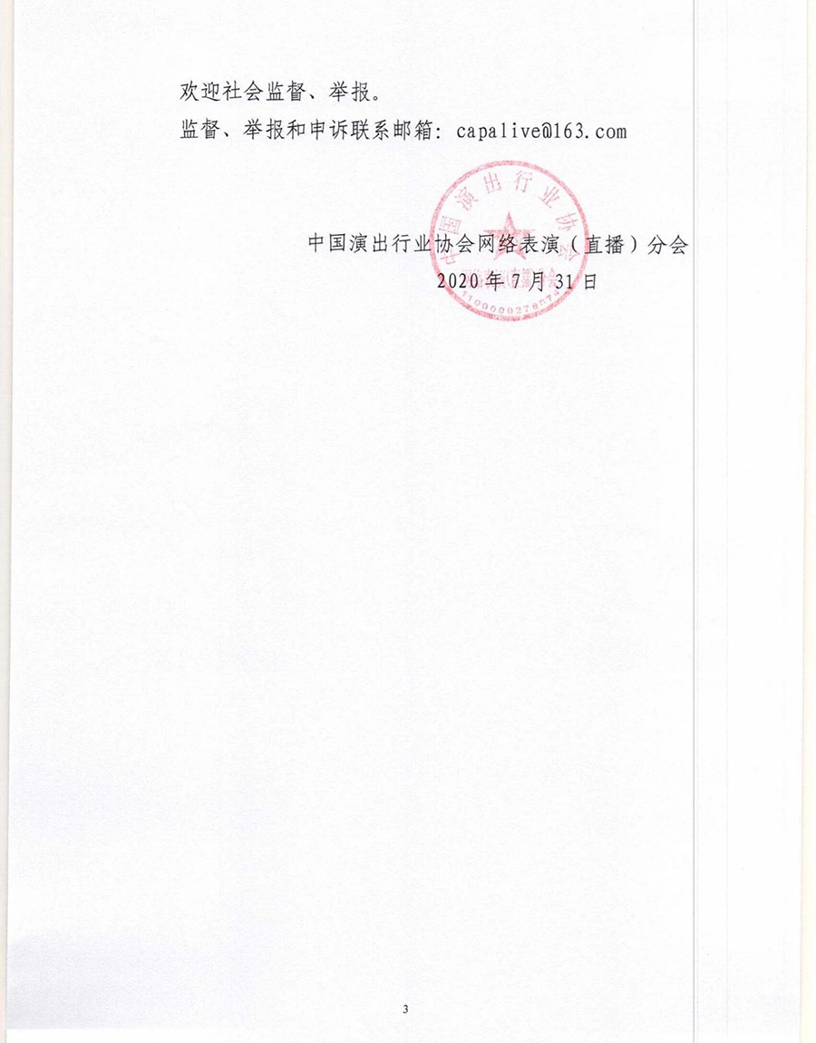 中國演出行業(yè)協(xié)會網(wǎng)絡(luò)表演(直播)分會8月9日發(fā)布: