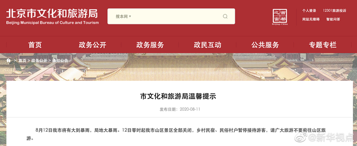 北京市文旅局11日晚間發(fā)布提示稱,8月12日北京將有大到暴雨,局地大暴雨,12日零時起本市山區(qū)景區(qū)全部關(guān)閉,鄉(xiāng)村民宿、民俗村戶暫停接待游客,廣大游客不要前往山區(qū)旅游。(記者張漫子) ?????