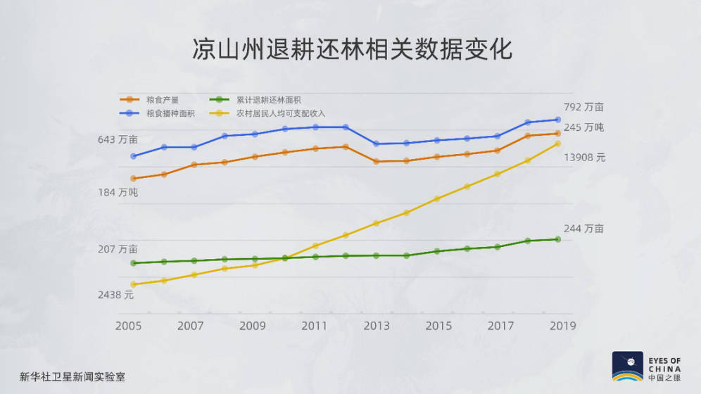 退耕還林后,涼山的實際播種面積從2004年的約600萬畝,增加到2019年的780萬畝。