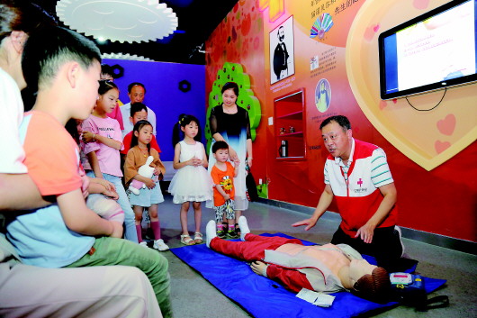 閔華在湖州市科技館為青少年及家屬講解演示心肺復蘇和AED操作。 受訪者供圖