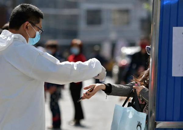 在武漢市武昌楚材社區(qū),工作人員為出入者測(cè)體溫