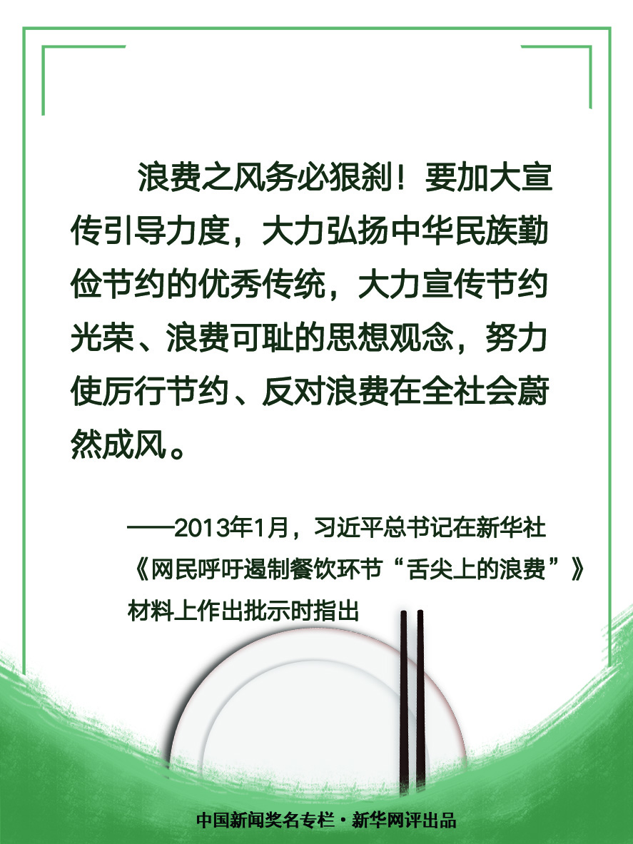 民以食為天,食以儉養(yǎng)德。餐飲浪費(fèi)現(xiàn)象存在著巨大危害,全社會(huì)必須深刻認(rèn)識(shí)勤儉節(jié)約的重要性。當(dāng)務(wù)之急,各地各部門、各餐飲機(jī)構(gòu)、每個(gè)人都要行動(dòng)起來,采取加強(qiáng)立法、強(qiáng)化監(jiān)管、加強(qiáng)宣傳教育等舉措,從我做起,從小事做起,進(jìn)一步營造勤儉節(jié)約之風(fēng)。(文字:馬若虎 海報(bào):張倩)