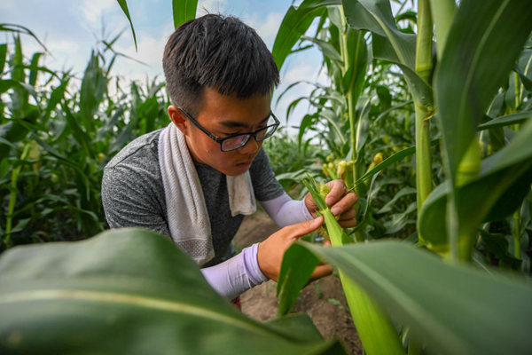 在吉林省梨樹縣四棵樹鄉(xiāng)三棵樹村的“科技小院”試驗(yàn)田,中國農(nóng)業(yè)大學(xué)在讀碩士沙野查看玉米長勢(2019年7月24日攝)。新華社記者 張楠 攝?