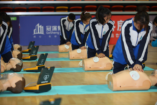 青年學(xué)生進行心肺復(fù)蘇操作學(xué)習(xí)。陳政/攝