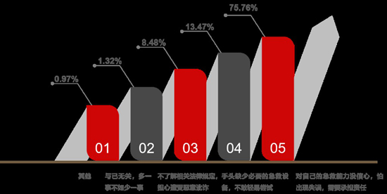 廉思課題組的報告顯示,缺乏急救知識是大學(xué)生不愿參與現(xiàn)場急救的原因之一。當遇到呼吸停止的無意識人員時,68.33%的被調(diào)查者選擇“撥打120,并在原地等候”,能“立即上前查看,并采取急救措施”的只有25.76%。
