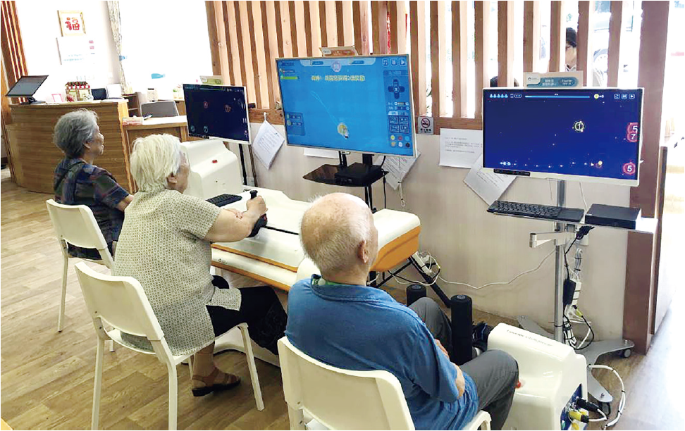 “在它們的陪伴下,康復(fù)就像做游戲,老人們都很喜歡玩?!睋?jù)照護(hù)家園負(fù)責(zé)人施君潔介紹,當(dāng)康復(fù)師設(shè)定好康復(fù)方案后,老人坐在電腦前,手肘放在肘托中,手指抓住操縱桿,屏幕上就會出現(xiàn)各種水果。老人可通過操縱桿上下左右移動抓水果,來達(dá)到康復(fù)訓(xùn)練的目的。