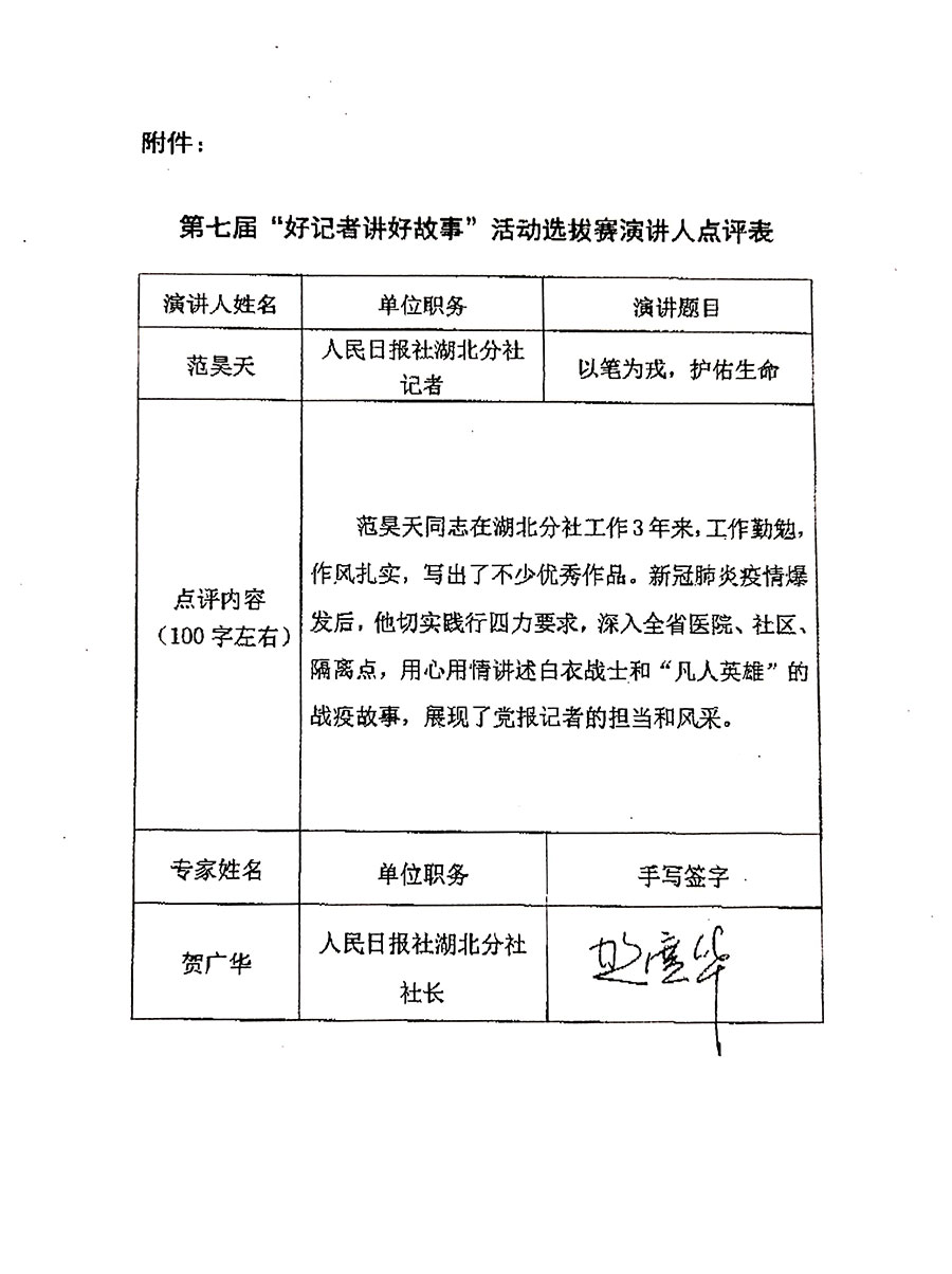 武漢爆發(fā)疫情以來(lái),湖北分社“90后”記者范昊天同志就一直奮戰(zhàn)在疫情防控一線,深入全省醫(yī)院、社區(qū)、隔離點(diǎn)采訪,參與推出《武漢 分秒必爭(zhēng)抗疫情》《武漢保衛(wèi)戰(zhàn)打響關(guān)鍵之役》《八古墩社區(qū)的這場(chǎng)保衛(wèi)戰(zhàn)》《黃岡戰(zhàn)“疫”,防控更嚴(yán)更實(shí)更細(xì)》等數(shù)十篇實(shí)地探訪的獨(dú)家深度報(bào)道,還采寫(xiě)呼吁各級(jí)干部下沉社區(qū)等多篇內(nèi)參,推動(dòng)解決基層防控難題。疫情期間,他和同事們不斷上報(bào)“四類(lèi)人員”信息,幫助大量患者得到妥善收治。2020年9月,隨分社榮獲“全國(guó)抗擊新冠肺炎疫情先進(jìn)集體”,本人獲得人民日?qǐng)?bào)社抗疫先進(jìn)個(gè)人、武漢市抗疫先進(jìn)個(gè)人等榮譽(yù)。