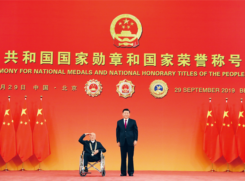 2019年9月29日,中華人民共和國國家勛章和國家榮譽(yù)稱號頒授儀式在北京人民大會堂金色大廳隆重舉行。中共中央總書記、國家主席、中央軍委主席習(xí)近平向“共和國勛章”獲得者張富清頒授勛章。 新華社記者 王曄/攝