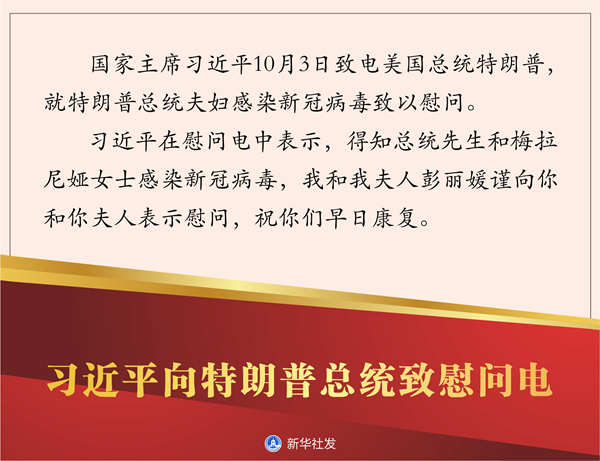 習近平在慰問電中表示,得知總統(tǒng)先生和梅拉尼婭女士感染新冠病毒,我和我夫人彭麗媛謹向你和你夫人表示慰問,祝你們早日康復。