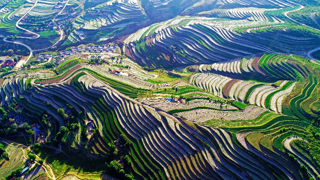 2019年6月9號拍攝于寧夏西吉縣偏城鄉(xiāng)上馬村。早上的太陽剛剛升起,照在薄膜地上猶如一道道發(fā)光的銀線,旱作梯田經(jīng)過改良,壯觀而又美麗。(蔡全錄攝)