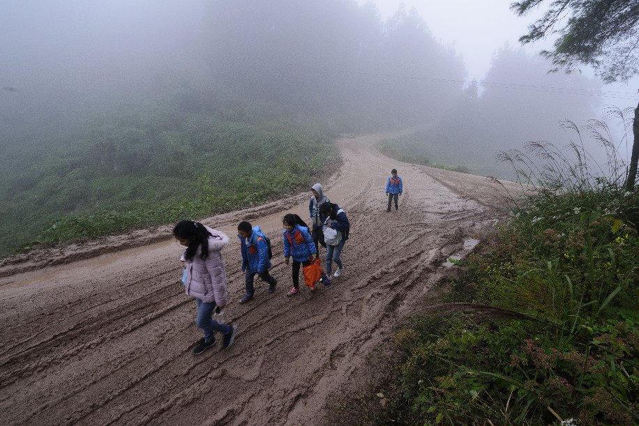 交通運(yùn)輸條件落后是重慶市貧困山區(qū)脫貧發(fā)展的制約短板。圖為重慶市綦江區(qū)橫山鎮(zhèn)水云軒小學(xué)生踩著泥濘道路上學(xué)場景。(楊奇 攝)