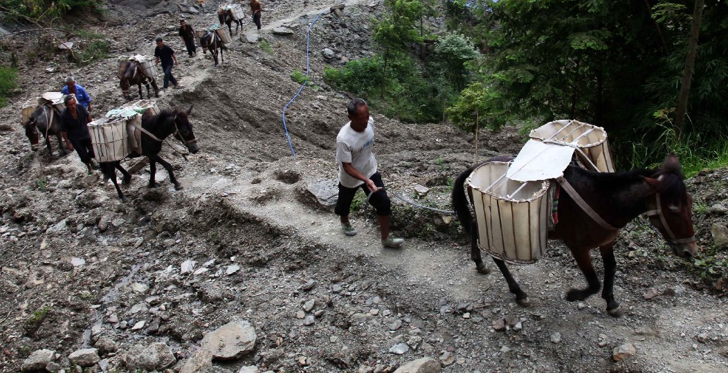 交通運(yùn)輸難問題突出,肩挑背磨和牲畜托運(yùn)是貧困山區(qū)物資運(yùn)輸?shù)闹饕绞?。圖為重慶市黔江區(qū)貧困鄉(xiāng)村馬幫運(yùn)輸農(nóng)用物資場景。(楊敏 攝)