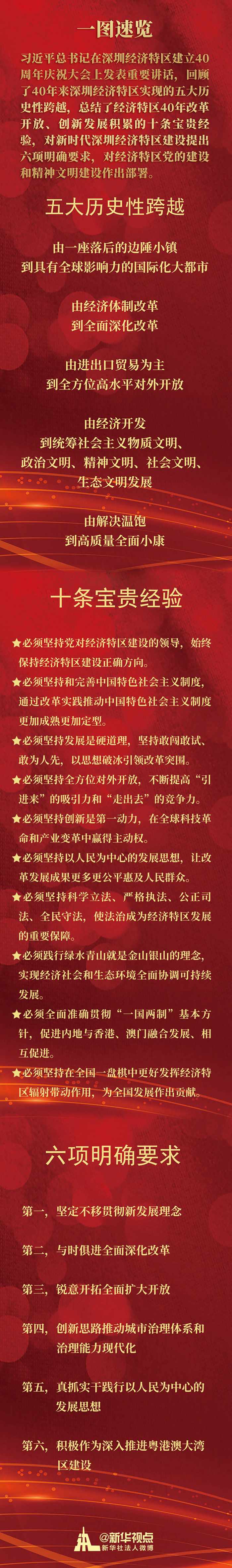 習(xí)近平總書記在深圳經(jīng)濟特區(qū)建立40周年慶祝大會上發(fā)表重要講話,回顧了40年來深圳經(jīng)濟特區(qū)實現(xiàn)的五大歷史性跨越,總結(jié)了經(jīng)濟特區(qū)40年改革開放、創(chuàng)新發(fā)展積累的十條寶貴經(jīng)驗,對新時代深圳經(jīng)濟特區(qū)建設(shè)提出六項明確要求,對經(jīng)濟特區(qū)黨的建設(shè)和精神文明建設(shè)作出部署。