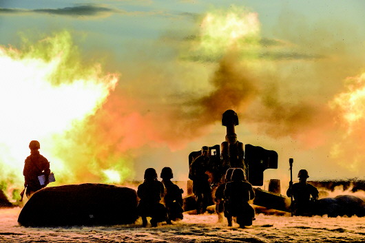 2017年8月25日,第74集團(tuán)軍某炮兵旅在西北戈壁組織實(shí)兵實(shí)彈戰(zhàn)術(shù)演習(xí),“志愿軍戰(zhàn)歌連”對“敵”實(shí)施火力打擊。新華社資料片