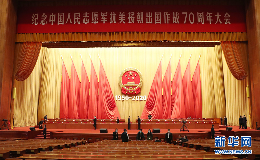 ??? 10月23日,紀念中國人民志愿軍抗美援朝出國作戰(zhàn)70周年大會在北京人民大會堂隆重舉行。圖為人民大會堂大禮堂。(新華網(wǎng) 翟子赫 攝)