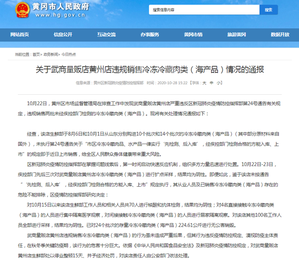 10月22日,黃州區(qū)市場(chǎng)監(jiān)督管理局在排查工作中發(fā)現(xiàn)武商量販店黃州店嚴(yán)重違反區(qū)新冠肺炎疫情防控指揮部第24號(hào)通告有關(guān)規(guī)定,違規(guī)銷(xiāo)售兩批未經(jīng)疾控部門(mén)檢測(cè)的冷凍冷藏肉類(lèi)(海產(chǎn)品)?,F(xiàn)將有關(guān)處理情況通報(bào)如下: