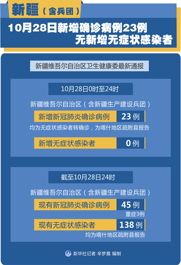 新華社烏魯木齊10月29日電(記者潘瑩、馬鍇)新疆維吾爾自治區(qū)衛(wèi)生健康委最新通報,10月28日0時至24時,新疆維吾爾自治區(qū)(含新疆生產建設兵團)報告新增新冠肺炎確診病例23例,均為無癥狀感染者轉確診,為喀什地區(qū)疏附縣報告;無新增無癥狀感染者。