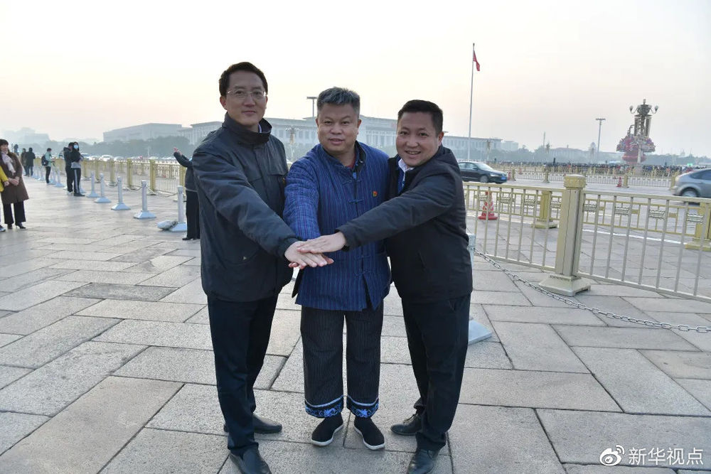 11月6日,十八洞村三任扶貧工作隊(duì)長龍秀林(中)、石登高(左一)、麻輝煌(右一)觀看升國旗儀式后同國旗合影 新華社記者李賀 攝